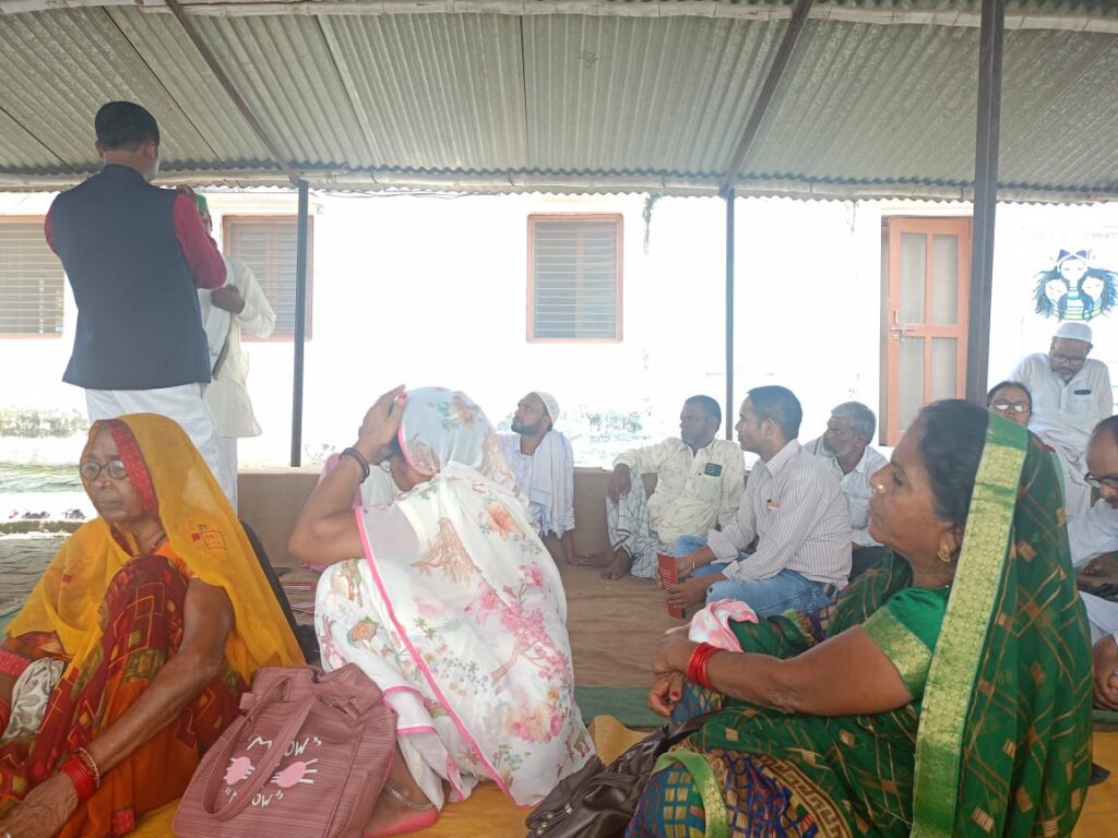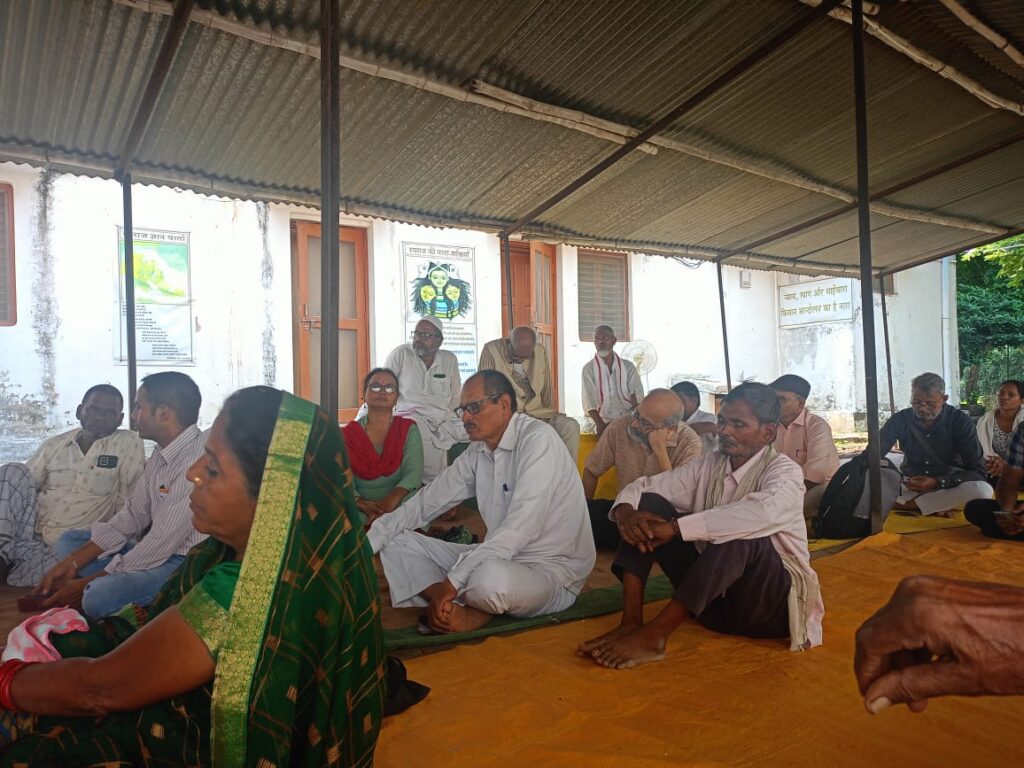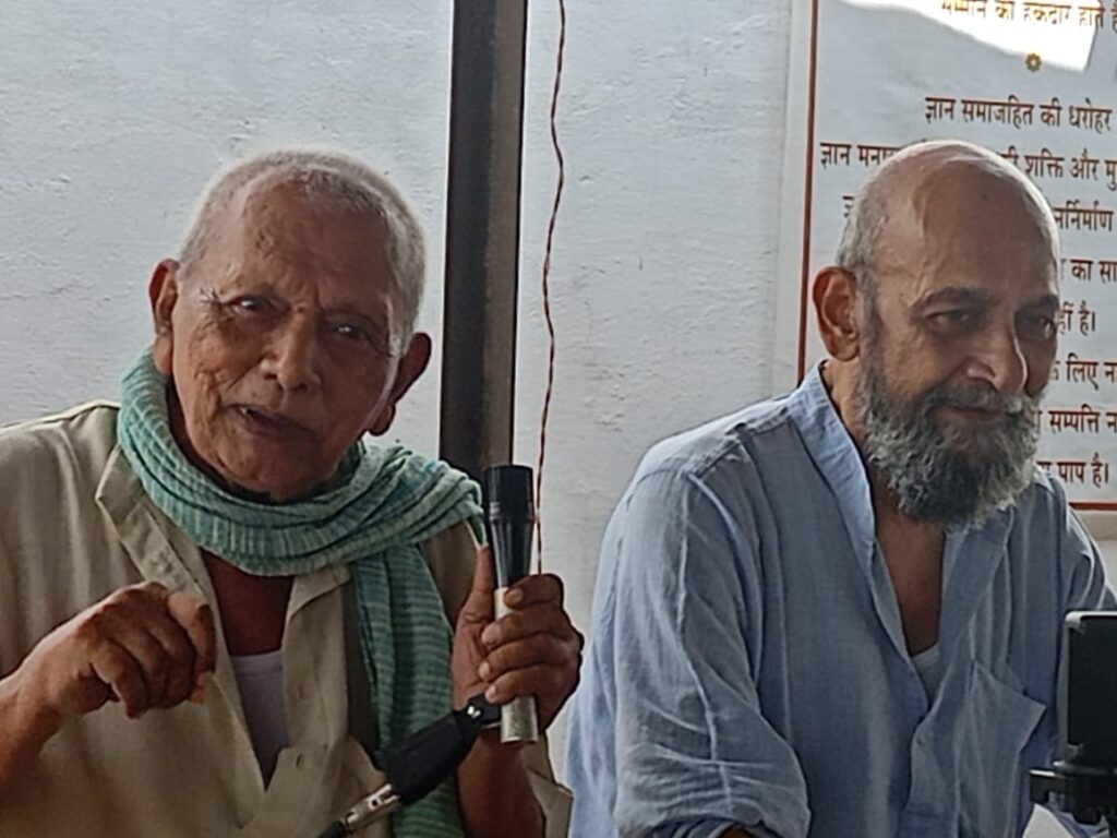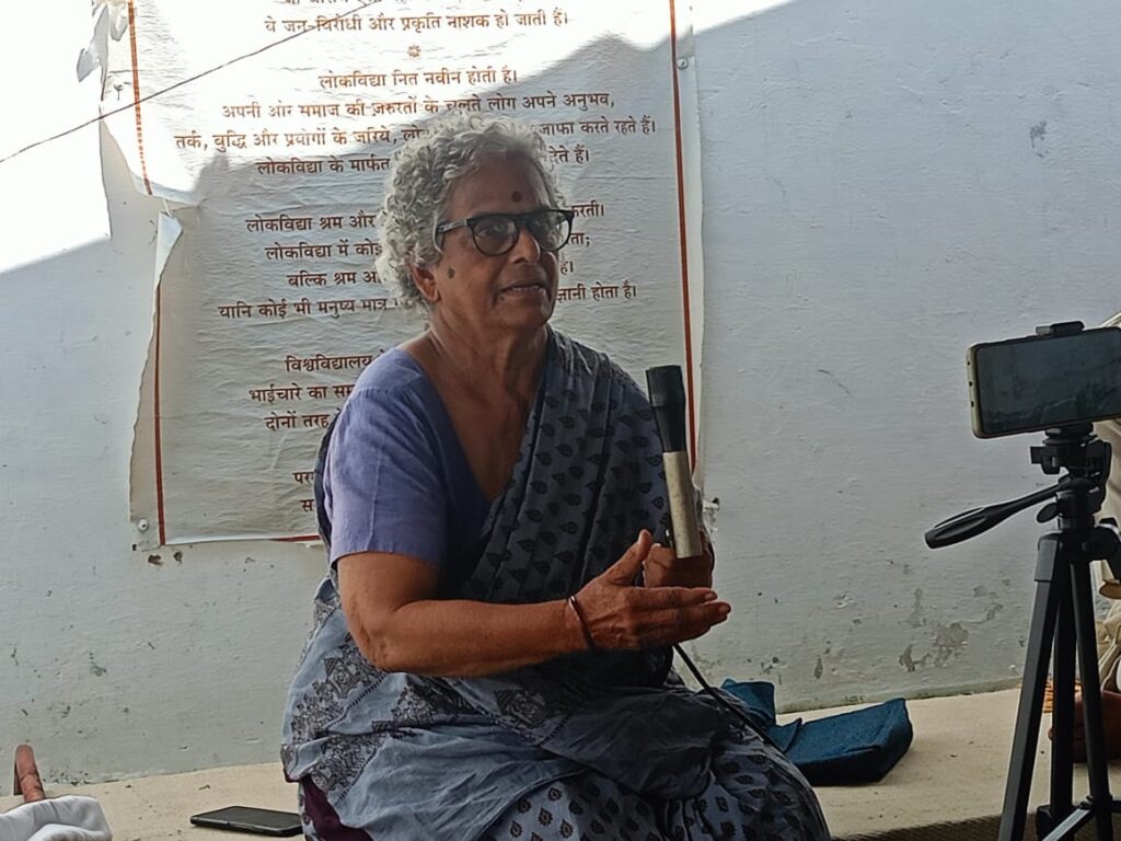 Samu Bhagat ji, accomplished singer of the Nirgun Vairaag tradition, captivated the sabha with song after song over the course of the three days. He was joined in some sessions by Sarvind Patel, another popular local folk singer and school teacher. Sunil ji and Chitra ji also recounted the history of the Vidya Ashram, as well as the emergence of the idea of Lokvidya, which grew out of a demand by the Nari Hasthkala Udyog Samiti (Women’s Handicraft Industry Association) to return the control of food and clothing to the hands of women.